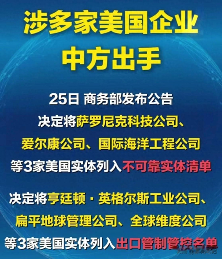 几天前,美方背后使坏,波兰截停中欧班列。9月25日,中国商务部发布公告,将萨罗尼克科技公司、爱尔康公司、国际海洋工程公司等3家实体列入不可靠实体清单。你断我陆路,那我就断你海路!